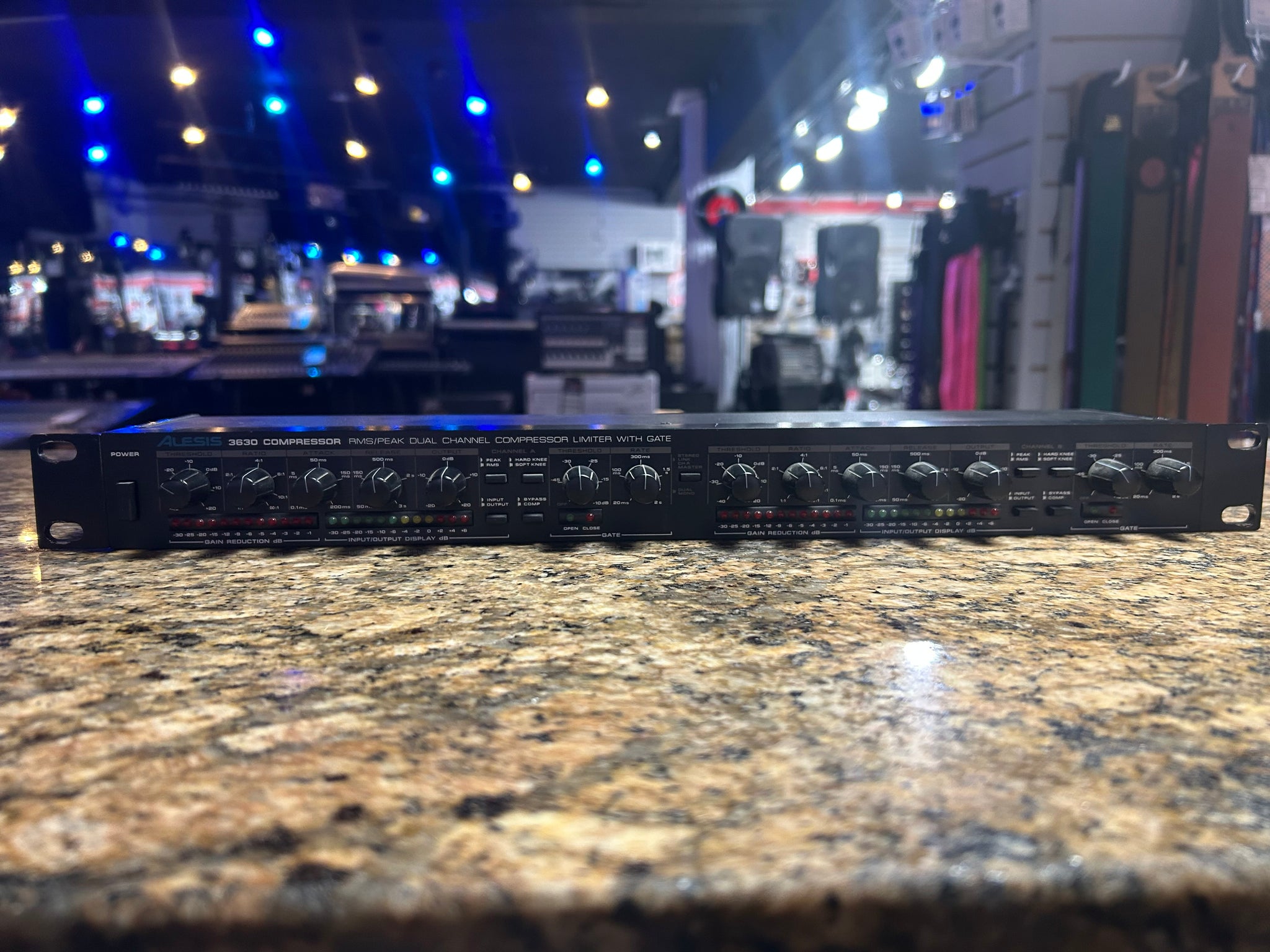 The Alesis 3630 is a vintage, dual-channel compressor/limiter with an integrated gate, known for its affordability and versatile use in both studio and live sound. It features independent channels with controls for threshold, ratio, attack, and decay, and offers both RMS and Peak compression styles, along with soft and hard knee options. The unit is also recognized for its sidechain input, stereo linking capabilities, and its distinct, often harsh, sound that was famously used by artists like Daft Punk.